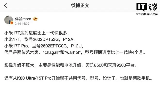该博主表示,小米17T标准版的型号是2602DPT53G,代码为P12A;Pro版的型号则是2602EPTC0G,代码为P12U。两款手机的内部代号分别是“Chagall”(马克·夏卡尔)和“Warhol”(安迪·沃霍尔),代表两位艺术家。从型号来看,其进度预计比上一代快了4个月。