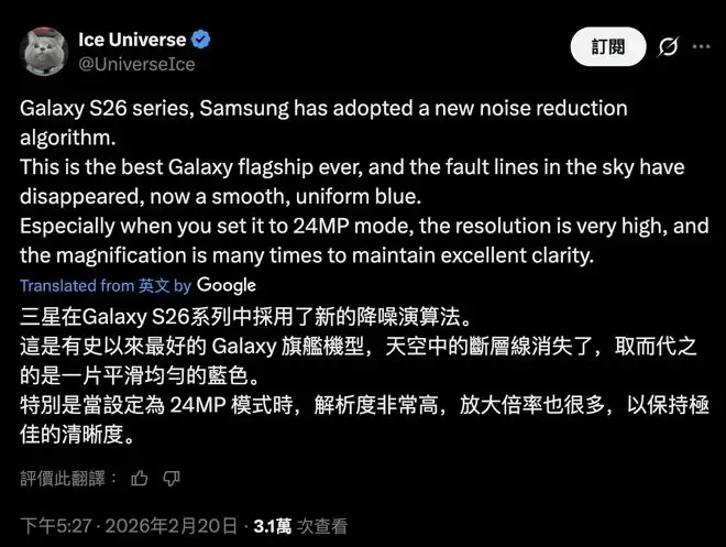 2月20日,据IT之家消息,爆料人@UniverseIce在X平台透露,三星为Galaxy S26系列手机升级了全新的降噪算法。