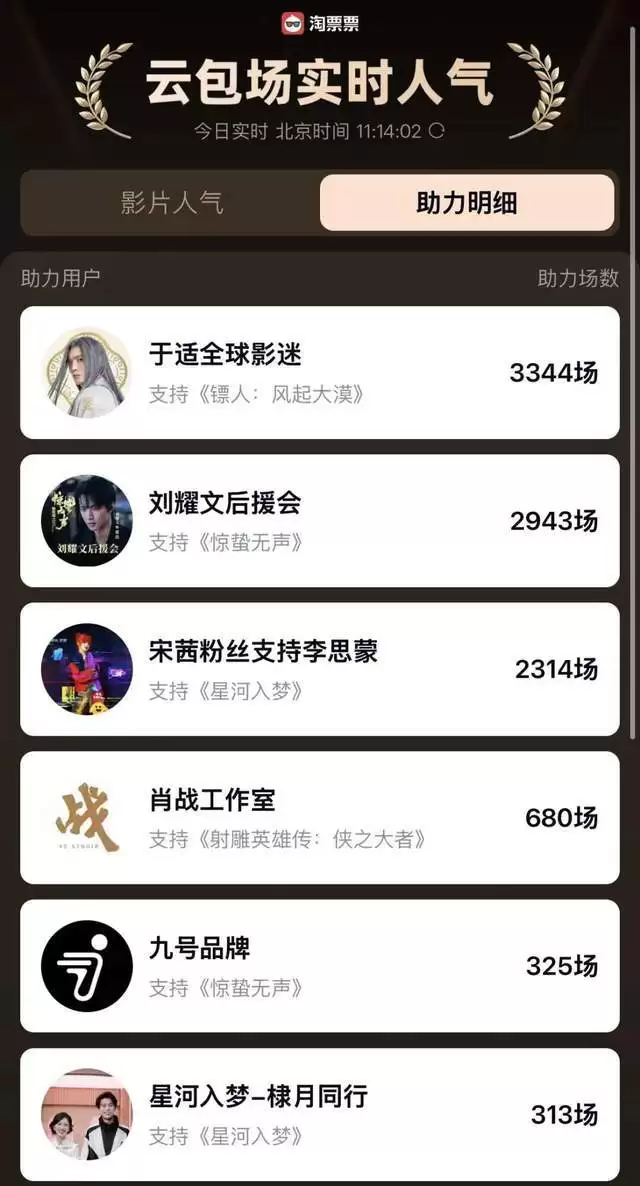相比之下,真正为《镖人》冲刺预售票房的,反而是排在吴京、谢霆锋之后的于适、陈丽君、李云霄、刘耀文等年轻演员。仅于适粉丝就云包场3315场以上,最终,云包场领票人数达22000+,可见年轻演员粉丝在预售阶段的拉动作用。