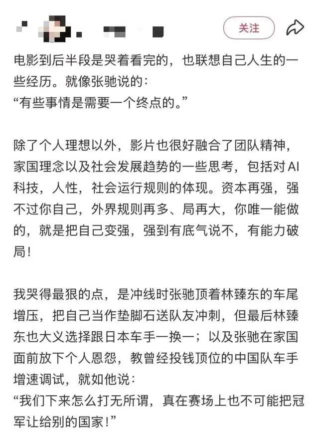 反倒是《飞驰人生3》拿了今年的“爱国”剧本。电影中,林臻东牺牲自己,用尾流“托举”张弛赢了日本赛车手的情节,让观众大呼感动,评价这段为全片最燃:“只要对战日本,中国人永远是一股绳。”