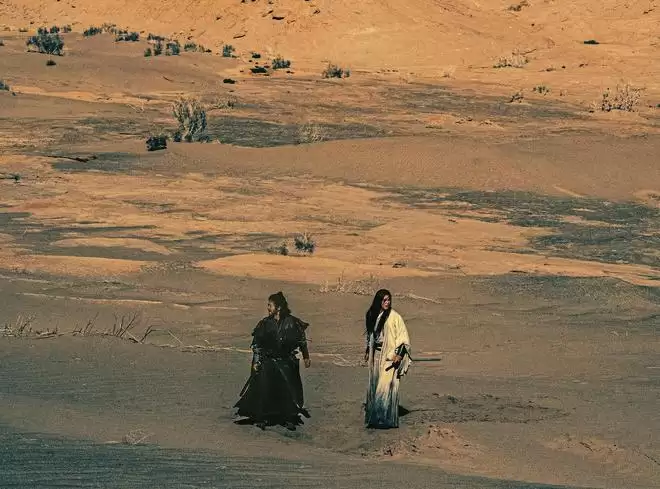 护镖小队乘坐的马车,承载了全片最柔软的"中式浪漫"。这辆马车像传统戏曲中的"客栈",在大漠绝境里汇聚了一群江湖儿女——刀马的沉默、竖的桀骜、知世郎的冷幽默、燕子娘那句"老娘还没玩够呢"的率性、阿育娅的隐忍与爆发……