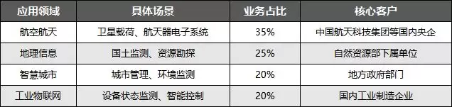 公司下游应用领域集中在高壁垒行业市场,以航空航天、地理信息、智慧城市、工业物联网为主,客户以央企、政府部门为主,合作关系稳定、复购率高,具体应用与客户情况如下: