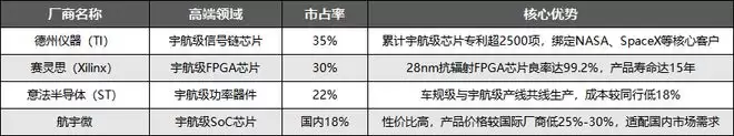 全球宇航级芯片市场呈现寡头垄断特征,德州仪器、赛灵思、意法半导体三家合计占据87%的市场份额,公司与国际头部厂商存在一定差距,但在性价比方面具备本土竞争优势,具体格局如下: