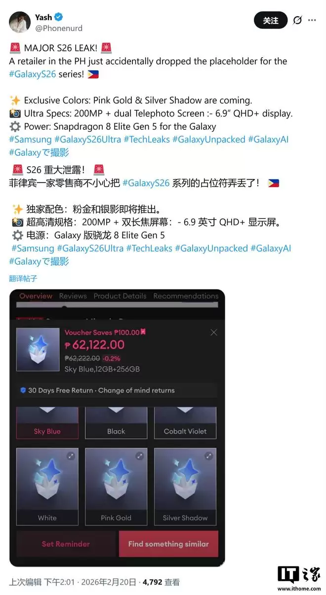 IT之家2月21日消息,据消息源@Phonenard昨日(2月20日)在X平台发布的推文显示,一家菲律宾电商平台提前上架了三星Galaxy S26系列产品页面,透露该系列将提供六种配色方案,其中包含两种线上专属配色。