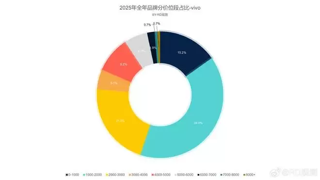 这是业内人士“RD观测”提供的vivo在2025年度各价位段的销量占比数据。信息显示,0-1000元价位机型占vivo总销量的15.2%;1000-2000元价位段占比高达39.9%;2000-3000元价位段占比为21.3%;3000-4000元价位段占5.1%;4000-5000元价位段占9.2%;5000-6000元价位段占6.0%;6000-7000元价位段占1.9%;而7000-8000元以及8000元以上价位段,各自仅占vivo总销量的0.7%。纵观各档位机型占比,最让业界感到意外的是,vivo销量占比最高的区间竟然集中在1000-2000元价位。