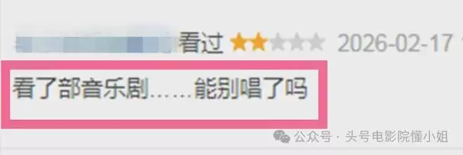 几次硬插上去的歌曲,简直降低整部电影的品质。有观众吐槽配乐“难听且突兀”,与剧情脱节得像“春晚语言类节目BGM”。音乐背景声不合时宜,恍惚之间,还以为自己在看MV。