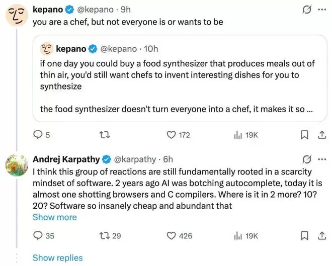 Karpathy 回复称,「我觉得这种反驳本质上还是囿于对软件的匮乏思维。两年前 AI 连自动补全都做不好,今天它已经能差不多一次性生成浏览器和 C 编译器了。再过两年呢?十年?二十年?当软件变得极其廉价、极其丰富时,现在意义上的离散式「应用」将毫无意义。那只是一些为了某个极其特定的目的而临时组装、执行一次就删掉的代码路径。你根本不需要知道什么,也不需要施加任何创意方向,这一切就能替你完成。如果今天的软件是代码砖块垒成的城堡,那未来更像是沸腾的代码浓汤。我不确定最终会不会完全是这样,过程肯定是混合的、渐进的,但从原理上说,它真的可能变得非常疯狂。」