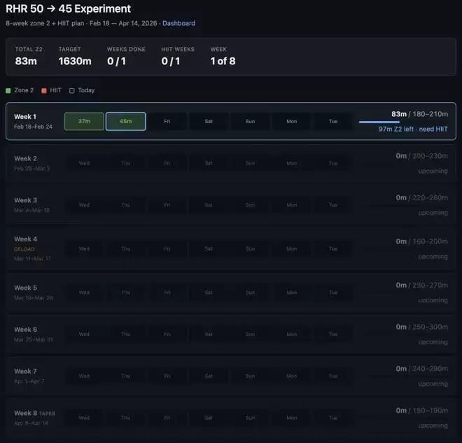 最近我在做 cardio(有氧运动)时有点松懈,所以决定认真做个为期八周的实验性训练,目标是让静息心率从 50 降到 45。主要方式就是达到 Zone 2(二区)有氧的累计分钟目标和每周一次 HIIT(高强度间歇训练)。