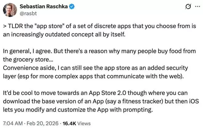 「总的来说,我同意这个观点。但很多人还是会去杂货店买吃的,这总归是有原因的…… 便利性暂且不论,我仍然认为应用商店可以充当一个额外的安全层,尤其是对那些与网络交互的复杂应用而言。如果能朝着「应用商店 2.0」的方向发展,那就太酷了。你可以下载一个应用的基础版本,比如某个健身追踪器,然后 iOS 允许你通过提示来修改和定制这个应用。」