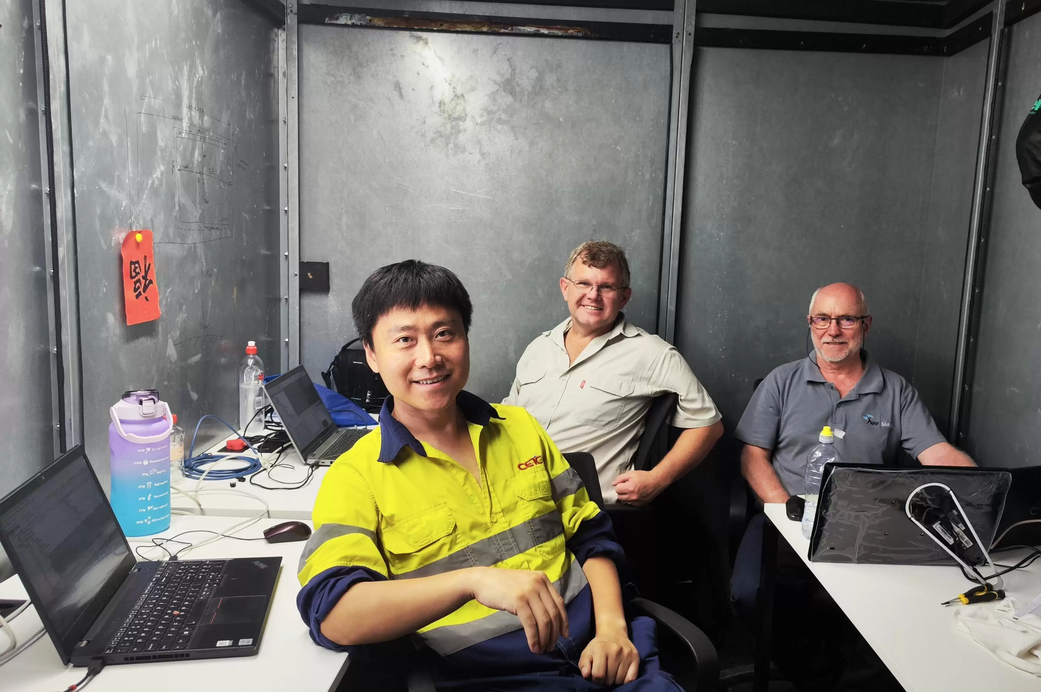 2月17日,大年初一,耿旭光(左)与国际合作团队在SKA中频天线建设现场的调试屋内测试天线性能。(受访者供图)