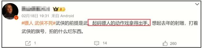 不过业内显然不这么看,他们言辞犀利,直接指出了两者的差距。认为作为武侠片,“武”是前提。可《射雕》打着武侠的旗号,却根本没拍出武侠的感觉。《镖人》即便有所争议,起码动作戏拿得出手。