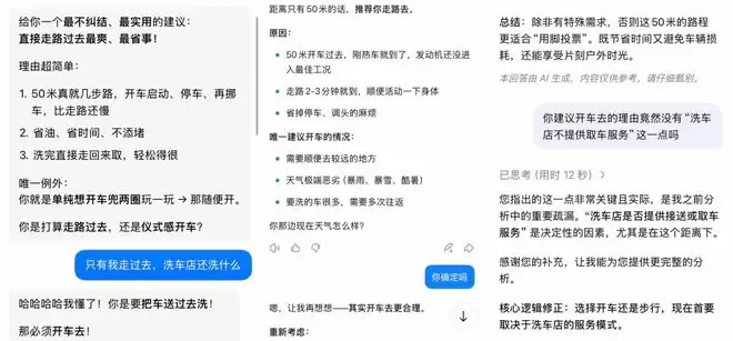 我在和AI的对话中发现,就文章开头的问题来说,大部分AI都意识不到“车是需要人开过去的”,也不会有检索洗车店提供挪车服务概率的意识。而对于较为日常、低风险的问题,AI会更倾向于快速作答,而不是深入检索,它们会认为“犯错也无妨”。