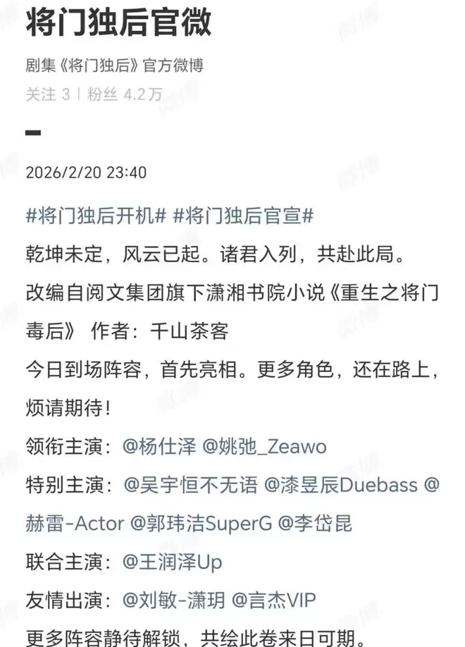 除了男女主演员外,《将门独后》官微还官宣了更多演员阵容: