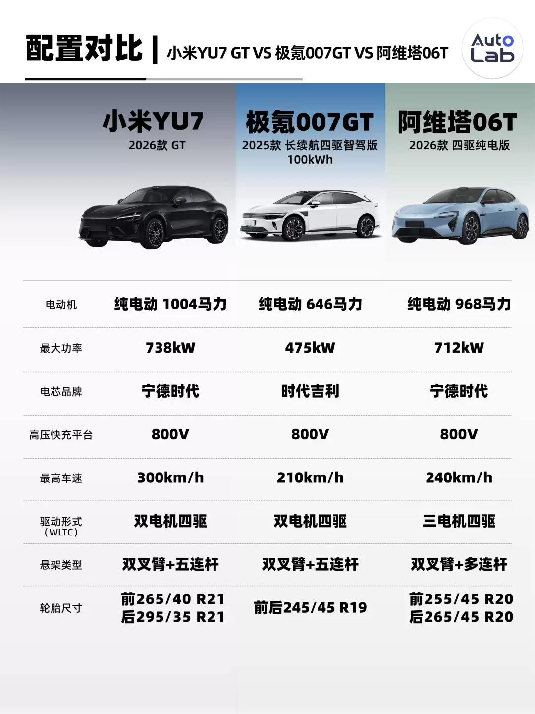 动力性能方面,三款车差异显著。阿维塔06T纯电版提供后置双电机及前单电机+后双电机的四驱方案,三电机四驱版系统总功率达712kW,总马力近1000匹,预计零百加速可进入2秒级别。小米YU7+GT的表现更为激进,双电机四驱版总功率738kW,马力达1004匹,极速可达300km/h,轮胎规格也更为激进,前265/40 R21、后295/35 R21的高性能宽胎,性能表现直逼小米YU7+Ultra。相比之下,极氪007GT显得更为克制,系统总功率475kW,零百加速2.95秒,虽不及前两者,但在实用与性能之间找到了平衡点。