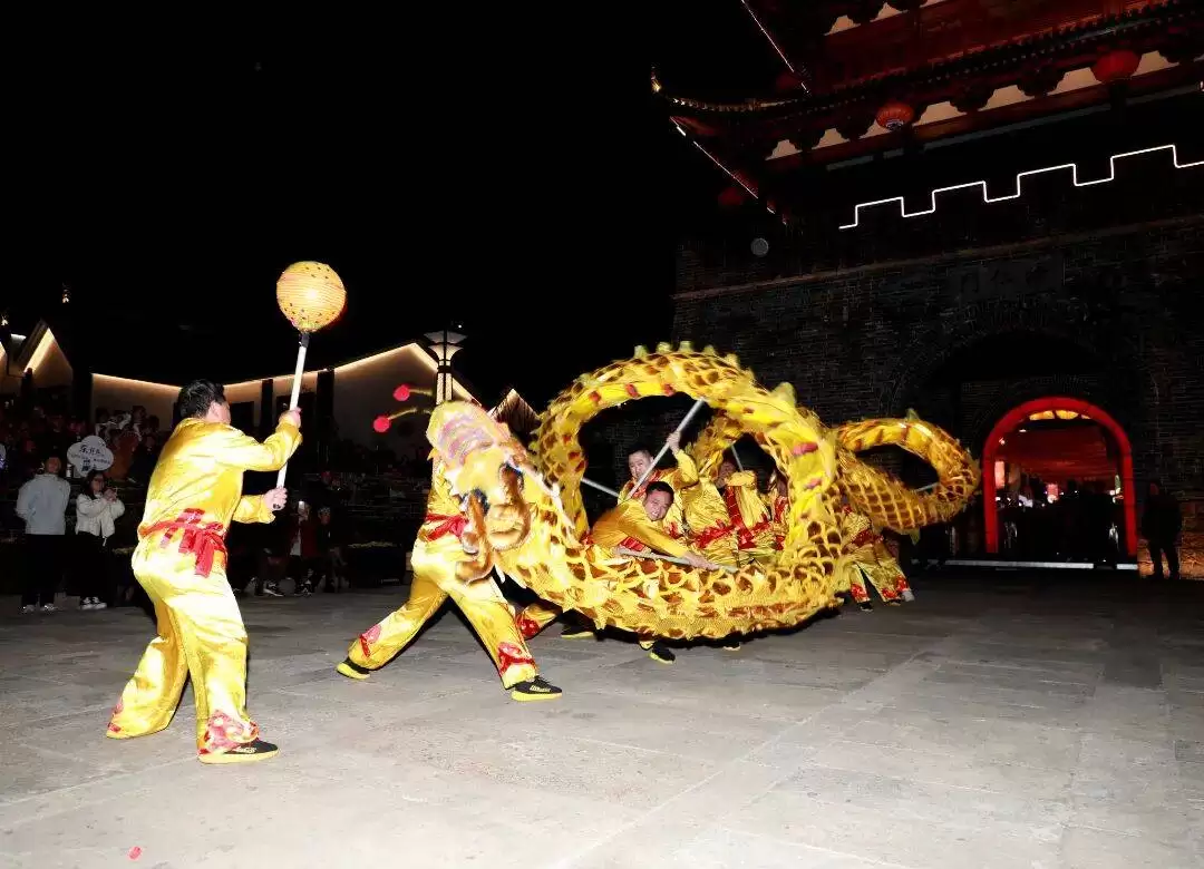 夜幕初垂,龙游大南门历史文化街区已是灯火璀璨。一场融合了传统非遗与现代科技的新春巡游展演,正徐徐拉开帷幕。锣鼓声起,由一只四足机器大狗带领的队伍率先登场。这只头顶金元宝、身贴福字的科技萌宠,迈着精准灵动的步伐沿街巡行,瞬间点燃了现场的热情。紧随其后的“五路财神”与小儿走马灯演员们身着华服,为沿途观众送上新春的祈福,欢呼声与喝彩声此起彼伏,交织成一片喜庆的海洋。