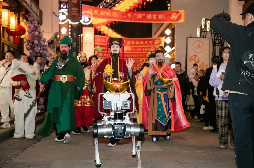 这场视觉盛宴中的科技元素,早在当日下午便已开始预热。由京格汇龙研发的轮式机器人与仿生机器狗在街巷间穿梭互动,不仅能主动挥手致意,还能与游客玩起“石头剪刀布”的游戏。这些充满未来感的设备成了最受欢迎的“明星”,游客丁女士感慨:“以前只在视频里见过,今天亲眼看到,实在太震撼了。”
