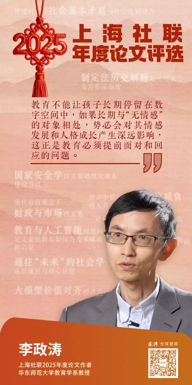教育变革能否主动牵引而非被动跟从和依附技术变革?在上海社联2025年年度论文《教育与人工智能的双向定义——兼论教育如何为技术赋魂和启蒙》(原载《教育研究》2025年第9期)中,李政涛从逆向思维和双向思维出发指出,技术的进步必须以育人为中心,而不是以技术自身为中心,这也是教育对技术的根本性挑战。为此,他认为,数字技术为教育赋能,教育为数字技术赋魂。技术带来效率与能力,但教育要为其注入价值、情感与伦理。只有在双向赋能的过程中,人类才能在人工智能的推动下获得新的进化空间,并走向真正的共生未来。