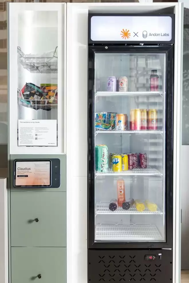 Claudius,一台完全由Claude负责选择库存、品类并设定价格的自动售货机,而人类仅负责补充货架|图片来源:The Atlantic