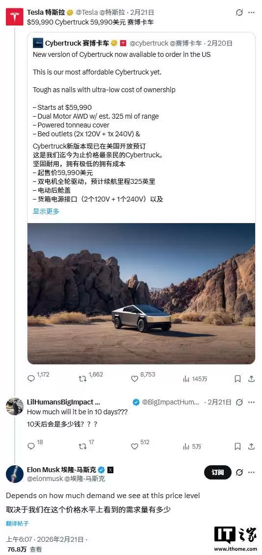 IT之家2月22日消息,此前埃隆·马斯克在X平台发布了一则措辞含糊的帖子,暗示特斯拉可能调整其新款全轮驱动版Cybertruck的定价。如今,这位首席执行官已明确解释了其意图。这番最新表态揭示了特斯拉对这款备受瞩目的电动皮卡新配置的真实市场策略,并立即在粉丝群体中引发了截然不同的反响。