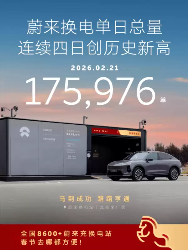 蔚来汽车近日宣布,其换电服务在春节期间迎来爆发式增长。2月21日(大年初五),蔚来全国换电站单日换电总量突破17.5万次,达到175976次,刷新历史纪录。值得注意的是,这是自农历新年以来,蔚来换电单日总量连续第四天创下新高,平均每0.5秒就有一辆蔚来车型完成换电补能,展现出用户对换电模式的高度认可。
