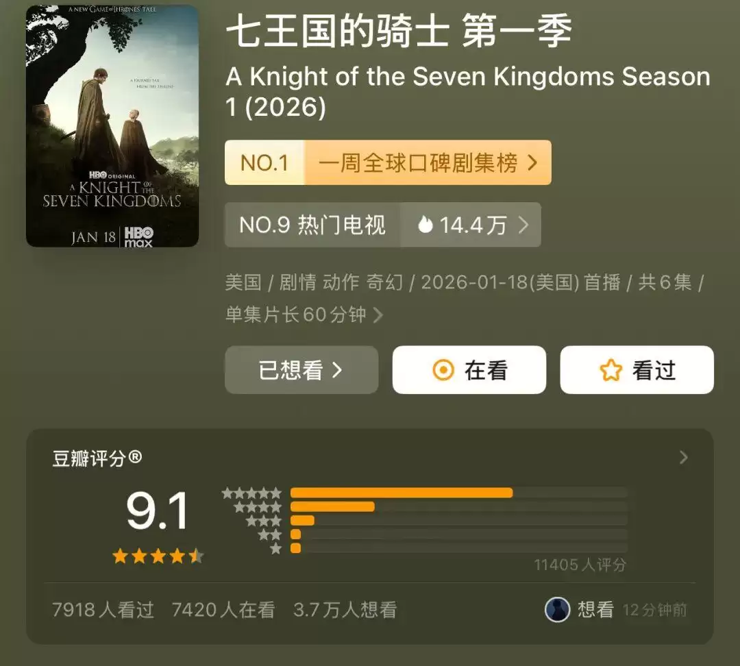 自从一月中旬开播以来,一个月时间相继播出了五集。在豆瓣平台,《七王国的骑士》的评分持续走高,开分时达到8.6分,如今已飙升至9.1分,五星好评占比超过66%,更是一举冲上了全球口碑剧集榜的榜首宝座。