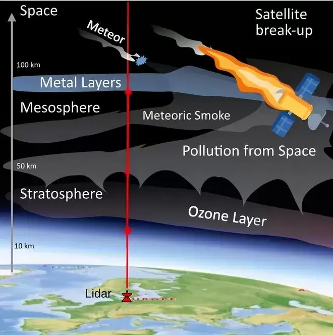 几年前,就有科学家在高空飞机上采集平流层气溶胶,发现直径大于 120 纳米的颗粒里,有大约 10% 含有卫星烧蚀留下来的金属成分。之前研究用的是飞机,飞不到 60 公里以上,只能测到已经沉降下来的颗粒。而本次研究人员使用的是激光雷达,直接测到了在 100 公里高处漂浮的原始污染。