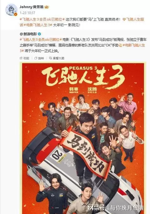 许多人一起拍了一张海报,沈腾站在一辆车上,手里拿着一副毛笔字,上面写的是电影名。