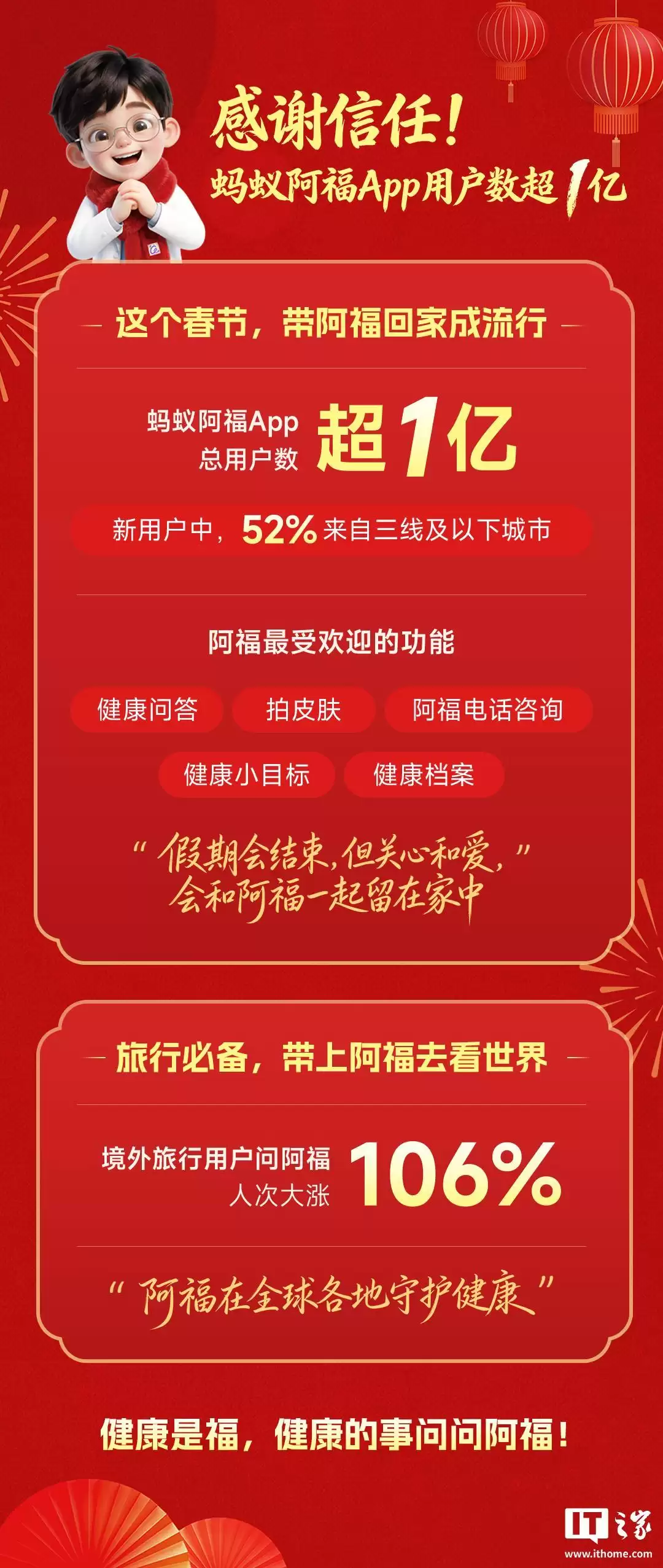 IT之家2月23日消息,蚂蚁阿福今日发布最新公告称,今年春节期间,蚂蚁阿福App的用户数量已突破1亿大关。