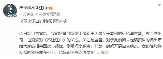 近日项目官宣后,我们留意到网络上涌现出大量关于本剧的讨论与声音,衷心感谢每一位观众对《不让江山》的关心、关注与监督。对于此前因未定稿资料的流出带给大家的相关困扰与担忧,剧组深表歉意,并第一时间开展自查整改。我们始终将观众的期待放在心上,也始终坚守以演员杨洋饰演的男主李叱为核心的创作初心,全力守护角色的完整与鲜活。