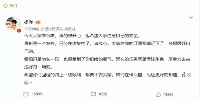 2月22日,演员杨洋在社交平台发文,回应手部骨折: