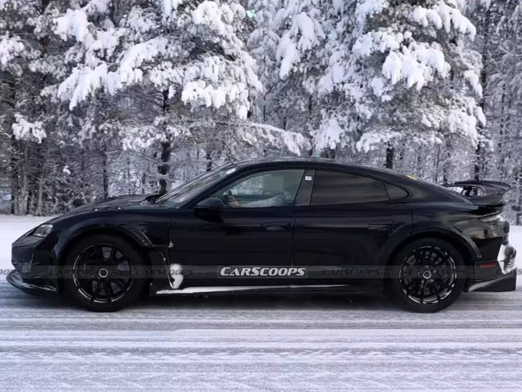 从曝光的谍照来看,这台强化版保时捷 Taycan 在外观设计上可谓大刀阔斧。其整体采用了全新的 RS 风格运动外观套件,视觉上更像一台随时准备征战赛道的量产车。前脸部分,前扰流板造型经过重新设计,摒弃了赛车风格的支架固定方式,线条更加流畅且富有攻击性。为适配更宽的轮距,工程师专门设计了宽大的轮拱护板,并在前轮后方新增了散热开口,这一设计不仅提升了车辆的空力学性能,还能有效降低高速行驶时刹车系统的温度,保障制动稳定性。