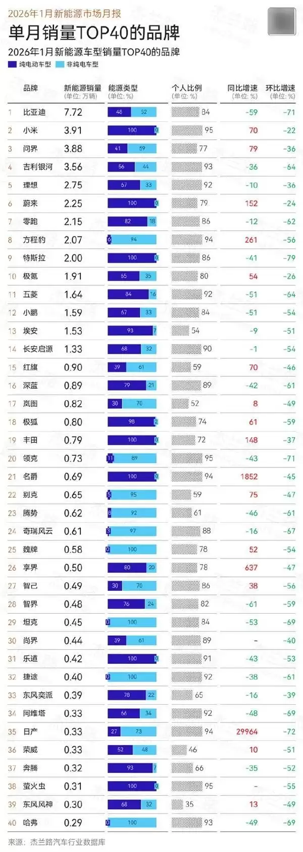 在新能源汽车市场竞争日益白热化的当下,小米汽车正以一种令人瞩目的速度强势崛起。最新行业数据显示,2026年1月国内新能源乘用车市场格局发生了显著变化,小米凭借3.91万辆的月销量跃居车企排行榜次席,不仅超越了特斯拉,更力压问界等强劲对手,仅次于行业龙头比亚迪。