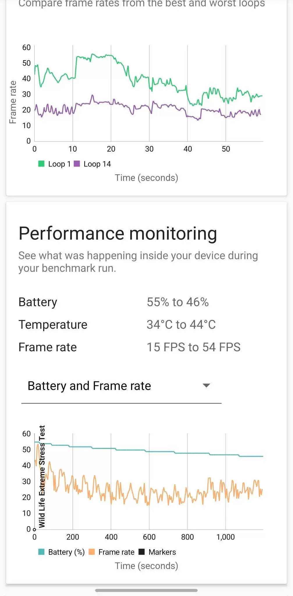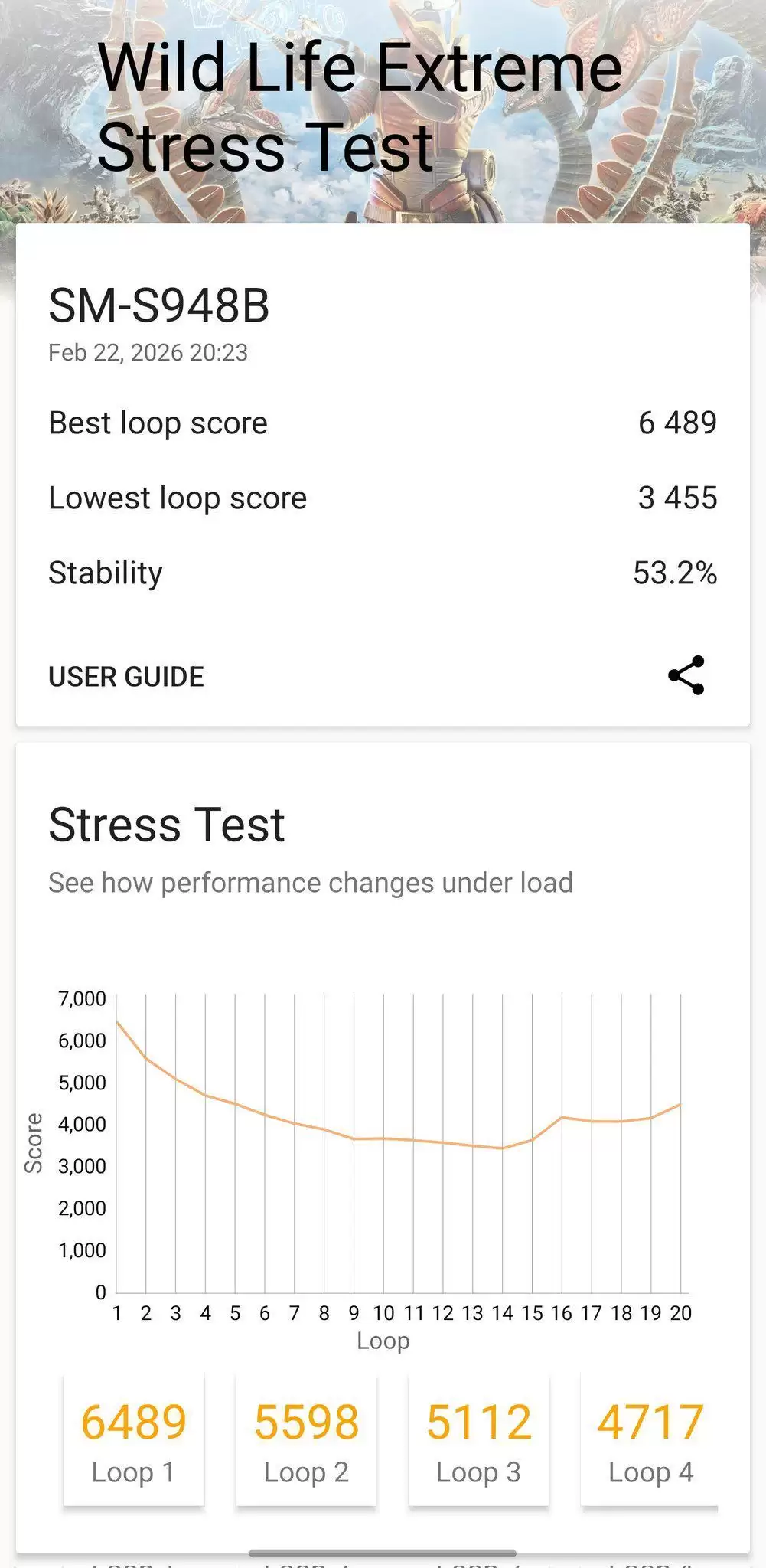 同时,该机完成了严苛的3DMark Wild Life Extreme压力测试,其最高循环分数为6489分,最低循环分数为3455分,系统稳定性达到53.2%。
