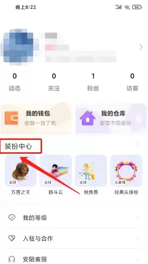 2、进入个人中心后,找到并点击【装扮中心】功能。