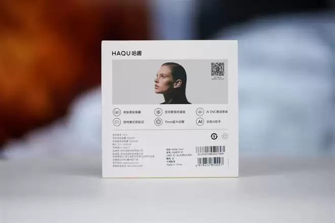 哈趣Ace1耳机包装盒十分简洁,正面印有品牌型号和产品形象,右下角是哈趣自己的柔贴配搭技术和超解析声学算法两枚"小金标"。