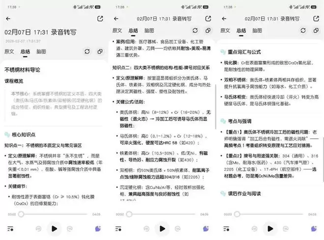 在录音转写完成之后,哈趣Popvee Link APP提供了五种不同的模型对转写生成的笔记进行分析,虽然转写中出现了一些错误,但我们使用课堂笔记对它进行分析提炼,同样可以生成完善的总结,包括概览,核心知识点以及考点与强调,甚至连课后作业和扩展阅读也有提供。