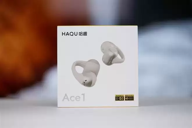 哈趣Ace1耳机包装盒十分简洁,正面印有品牌型号和产品形象,右下角是哈趣自己的柔贴配搭技术和超解析声学算法两枚"小金标"。