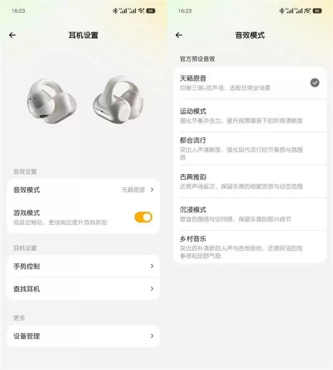 点击APP首页上半部分的耳机图像,就可以进入耳机设置,哈趣的Popvee Link APP中为耳机准备了六种音效模式,可以让用户根据自己的喜好和聆听的音乐类型,选择合适的模式。