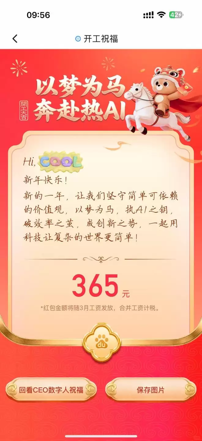 2月24日,开工首日,百度通过创始人李彦宏的数字人为每位员工发放开工随机红包,红包金额涵盖了365元、588元、666元、888元及2026元等多种面额。员工有机会领取最高达2026元的超值开工红包,实习生也能获得188元的开工好礼。