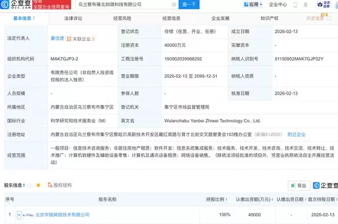 企查查APP信息显示,近日有三家科技公司相继成立:乌兰察布雁北知微科技有限公司、呼和浩特塞北盛乐科技有限公司以及呼和浩特塞北云基科技有限公司。这三家企业的法定代表人均为董佳建,注册资本分别为4亿元、11亿元和13亿元人民币。企查查的股权穿透数据显示,这三家公司均由北京字跳网络技术有限公司全资控股。