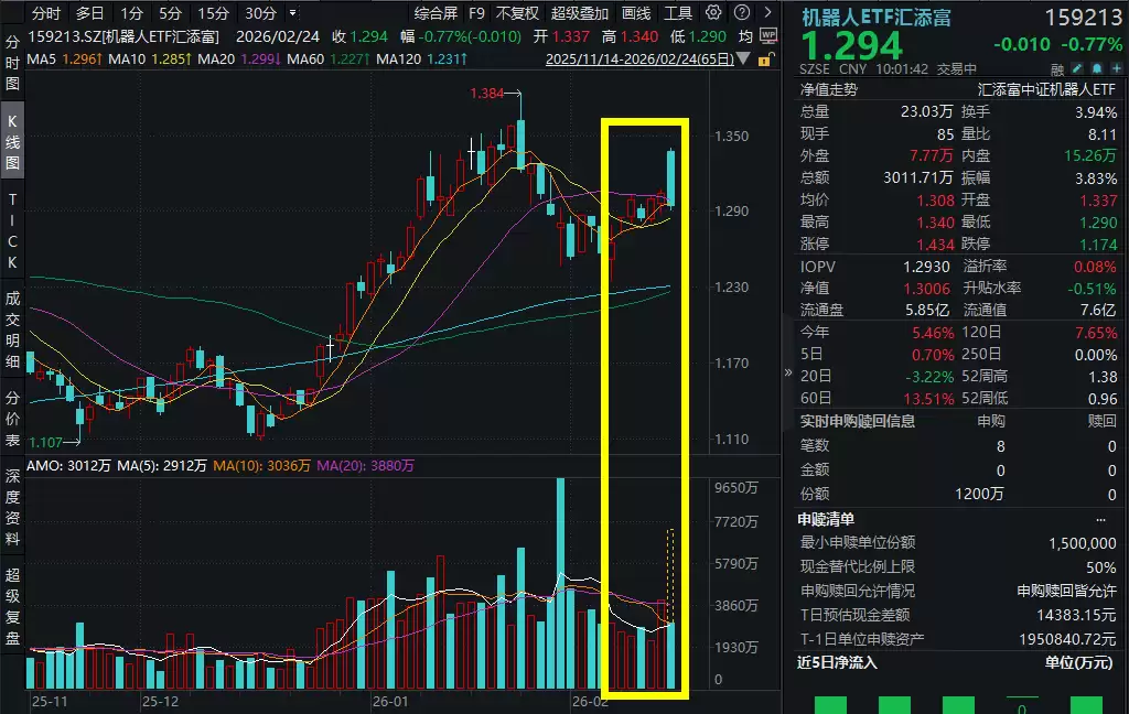 2月24日,A股市场整体走势强劲,但机器人板块却上演了高开低走的行情。机器人ETF汇添富早盘一度上涨超过2.5%,但到了10点02分,涨幅已经转为下跌0.77%,成交额也突破了3000万元。虽然板块整体有所回调,但资金热度不减,该ETF开盘仅20分钟就吸引了超过1500万元资金流入。