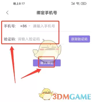 2、进入绑定手机号页面,输入手机号码和验证码,点击"确认绑定"选项。