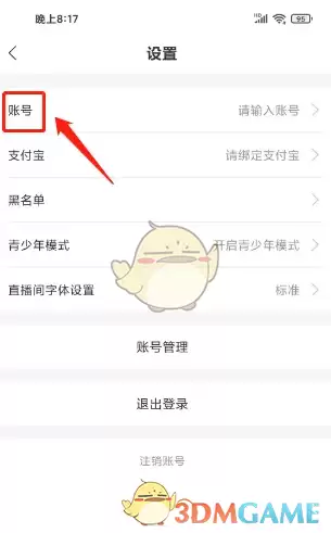 1、打开安陌直播APP后,进入设置页面,点击"账号"选项。
