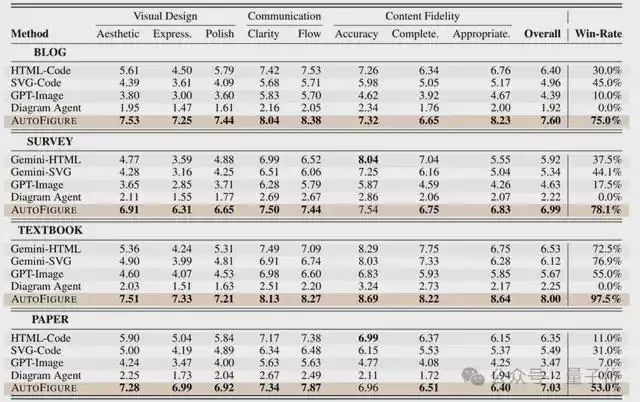 降维打击:在逻辑清晰度和准确度上,AutoFigure的优势极大,在教科书类任务中胜率甚至高达97.5%。