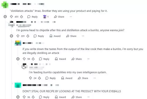Anthropic将蒸馏行为称为“蒸馏攻击”,这一说法本质上也有些“文字游戏”的嫌疑。多位Reddit网友认为,即便其他公司确实利用其产品生成的数据进行训练,这本质上也只是用户在正常使用产品,而且这些用户是付了费的。