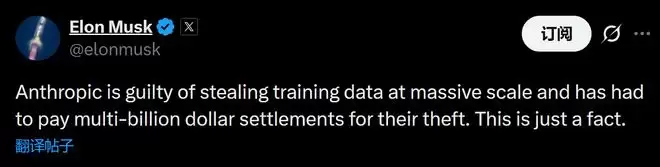 马斯克进一步补充道:“Anthropic已经犯有大规模窃取训练数据的罪行,他们必须为其盗窃行为支付数十亿美元的赔偿金。这就是事实。”