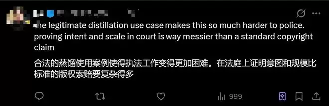 另一位网友认为,合法蒸馏使用的存在,让监管工作变得更难,因为证明企业使用模型的意图和规模,要比传统的版权索赔复杂得多。