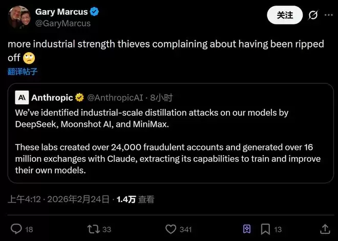 知名AI评论家Garry Marcus认为,Anthropic的行为是“肆无忌惮的盗贼抱怨自己被抢劫了”。