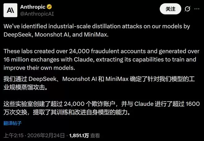 智东西2月24日报道,今天,美国大模型独角兽Anthropic连续发布多则推文、博客,指控DeepSeek、月之暗面和MiniMax三家中国AI实验室,正对Claude进行“工业级规模的蒸馏攻击”。