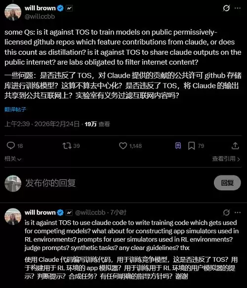 有不少海外技术圈人士也关注到了这一现象。AI训练平台Prime Intellect的工程师Will Brown提出了大量问题。比如,使用Claude贡献的开源GitHub代码训练模型,算不算蒸馏?把Claude的数据公开分享到互联网上,违不违反用户协定?用Claude Code写训练代码,用于训练竞对模型,违不违反用户协定?